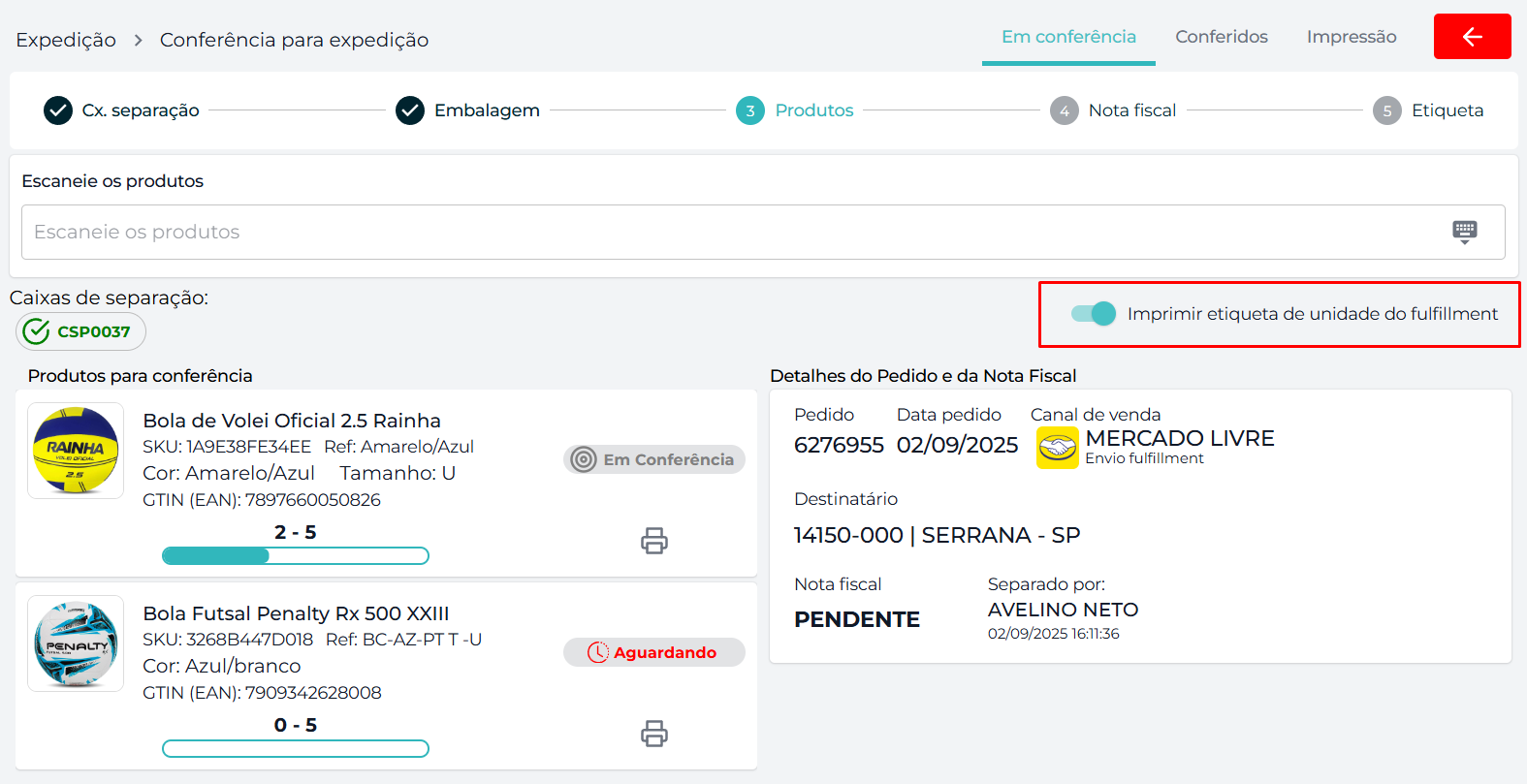 Ao habilitar essa função, o sistema imprime automaticamente uma etiqueta fulfillment a cada bip de um item conferido. Isso garante que cada produto tenha sua identificação no momento exato em que é validado, agilizando o fluxo.