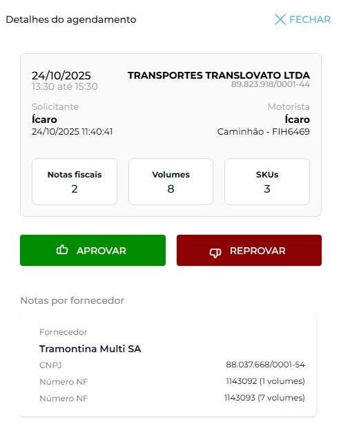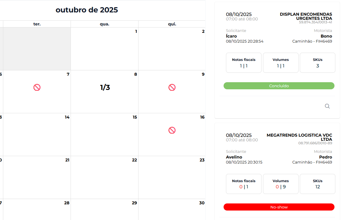 A agenda oferece uma visão detalhada de todas as notas programadas, exibindo fornecedor, transportadora, número da nota, volumes e SKUs em uma única tela. E se a transportadora não comparecer, basta marcar um "No-Show" para que ela receba automaticamente um e-mail para reagendar.