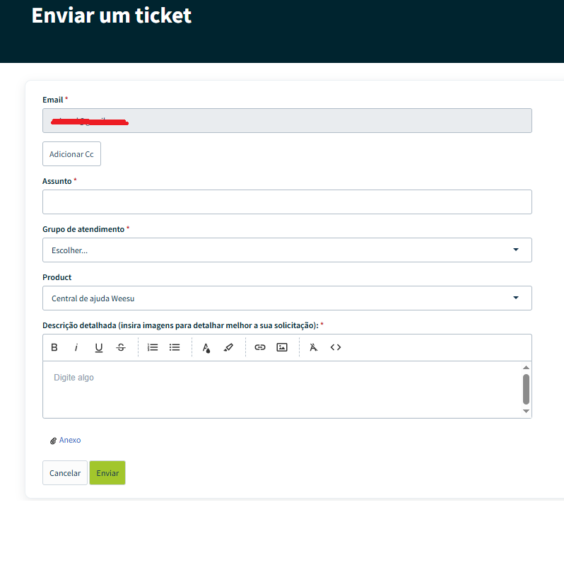 - Anexos (prints de tela, planilhas ou arquivos que ajudem o suporte).