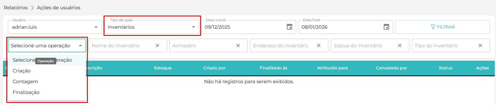 Aprimoramos a auditoria do que acontece no estoque. Ao filtrar as ações dos usuários relacionadas a inventários, agora você tem controle total. É possível filtrar e saber exatamente: